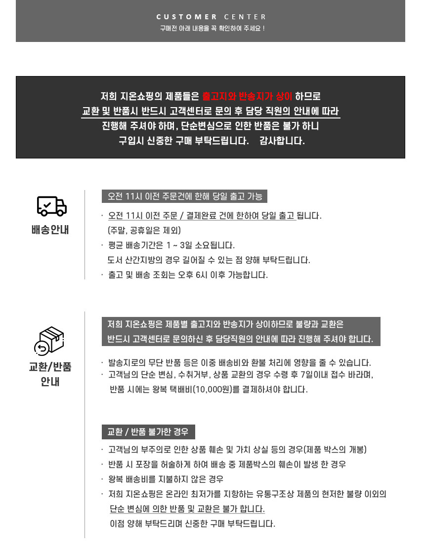 상품상세설명에 배송/교환/반품/취소 관련 안내가 기재된 경우 다음 안내사항보다 우선 적용됩니다.