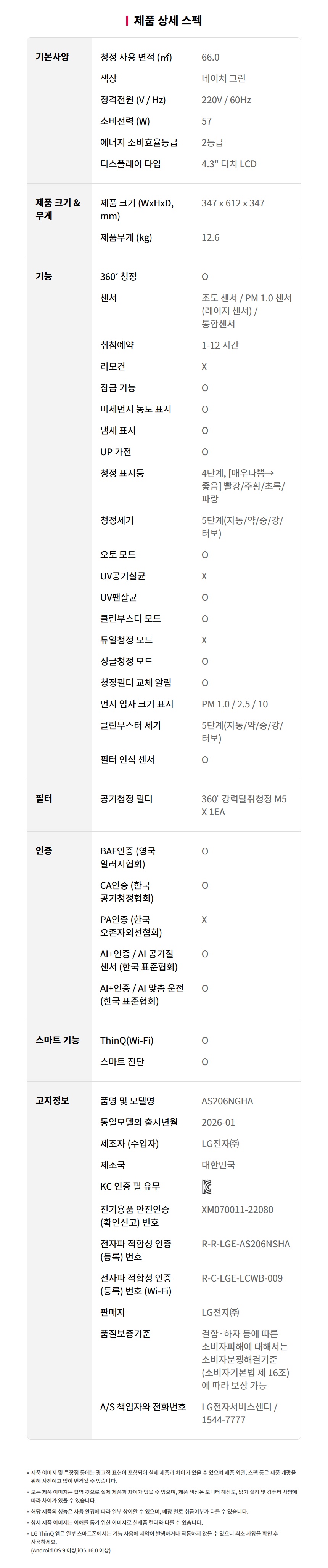 [LG전자] 퓨리케어 AI 오브제컬렉션 360 공기청정기 M5 1단 2등급 (AS206NGHA)