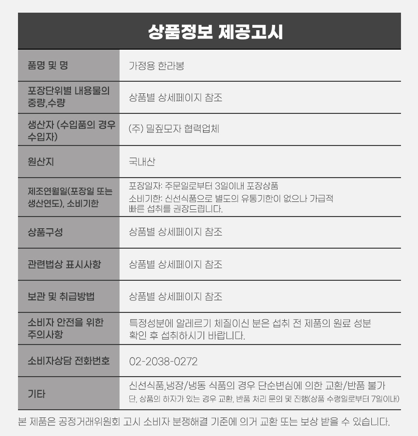 • 신선식품의 경우 재판매가 불가능한 제품 특성상 단순변심 및 개인적 입맛 차이로 인한 반품은 불가능하며 제품 수령 후 문제가 있는 경우 이상부분 사진 촬영하여 수령하신 날짜 기준 2일 이내 연락해주셔야합니다.(기일은 업체별 상이할 수 있으니 수령즉시 연락 부탁드리겠습니다.)