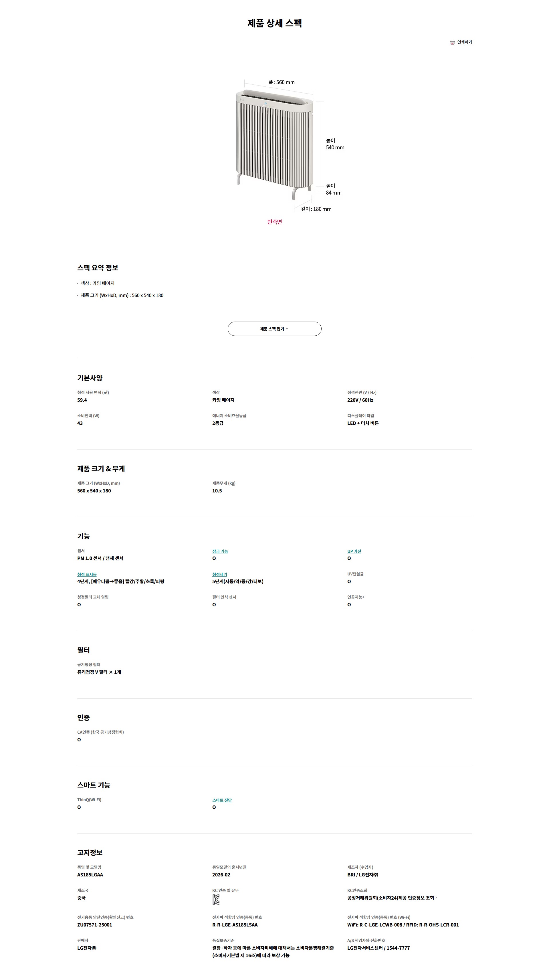 ★기간특가★[LG전자] 퓨리케어 AI 오브제컬렉션 월핏 스탠드 2등급 (AS185LGAA)
