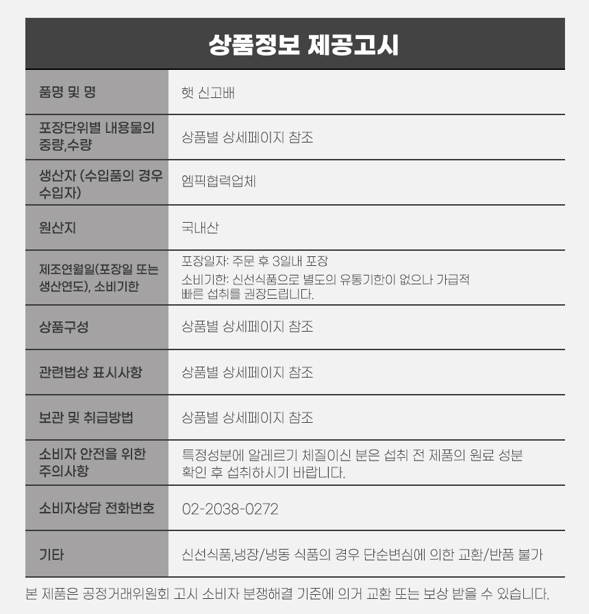 • 신선식품의 경우 재판매가 불가능한 제품 특성상 단순변심 및 개인적 입맛 차이로 인한 반품은 불가능하며 제품 수령 후 문제가 있는 경우 이상부분 사진 촬영하여 수령하신 날짜 기준 2일 이내 연락해주셔야합니다.(기일은 업체별 상이할 수 있으니 수령즉시 연락 부탁드리겠습니다.)